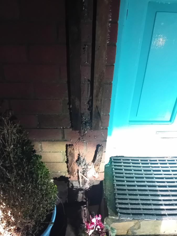 Storm brought down part of plastic front door surround, ooden batons underneath half rotted see photos