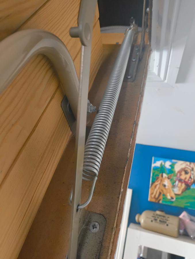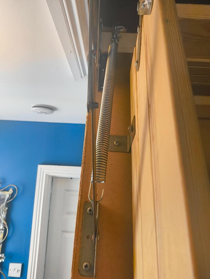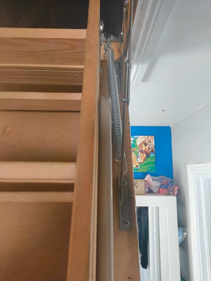 Tighten /or replace? springs on wooden attic folding stairs/ replace catch mechanism on trap door. (Stairs coming down too fast, used to gradually drop)