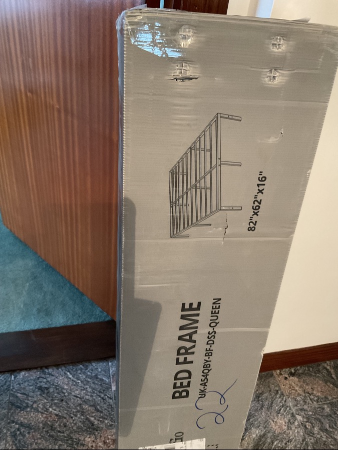 Furniture Assembly and moving boxspring. Need help with assembling queen bed frame from Amazon and moving old boxspring to basement.
