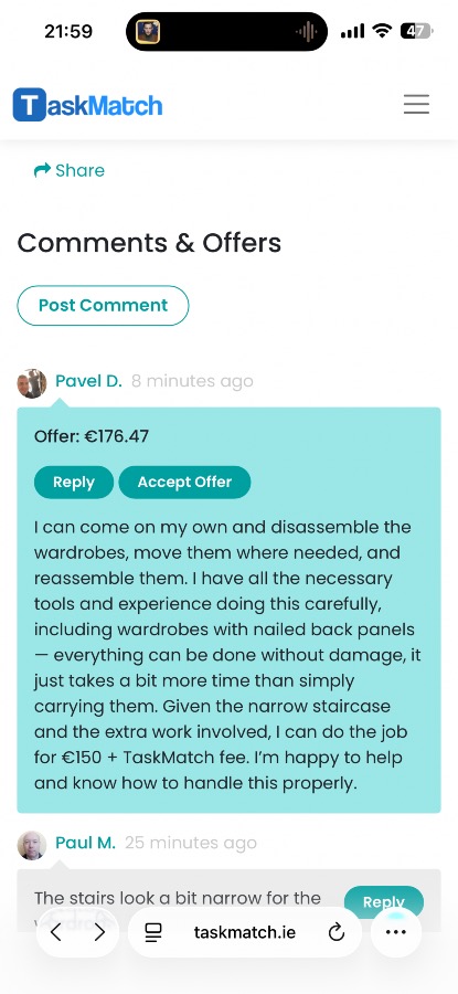 @Fiachra M. How much to add on if you were to assemble the bed/wardrobe/drawers and couch? We could do the rest ourselves