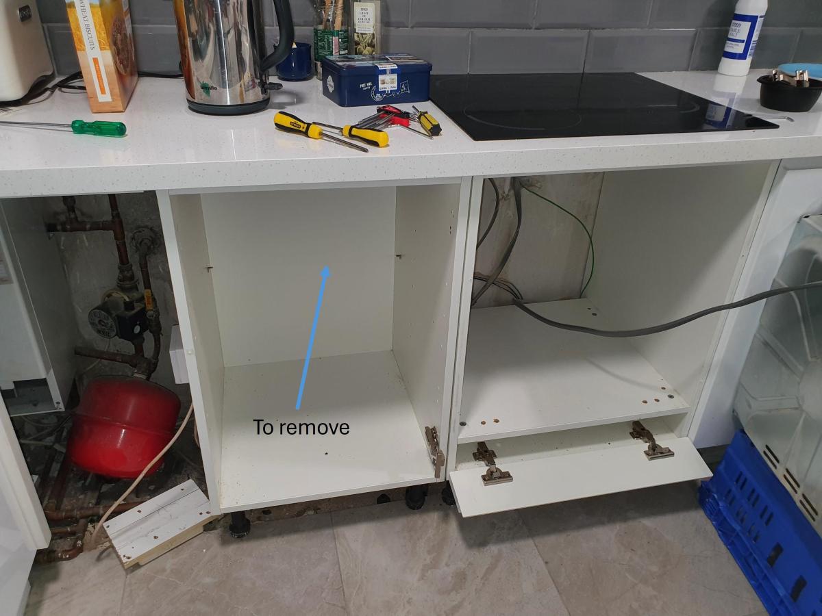 I need to remove the single, under-counter kitchen cabinet (indicated by arrow in the photo on the left hand side) so that we can install a new boiler. However, I cannot get it out. There is a single attachment site that I cannot see which is securing it to the unit on the right (this unit needs to stay as this is where the oven goes). The unit to be removed will be discarded, so can be damaged if needed.