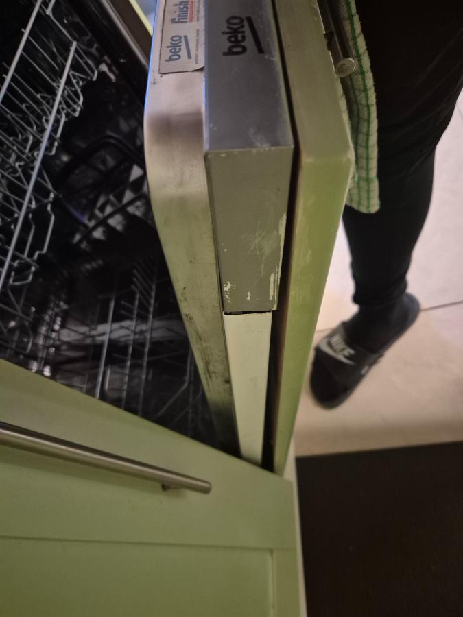 Repair cabinet facade on dishwasher that has come loose so that the dishwasher can close tightly and is properly stabilised
