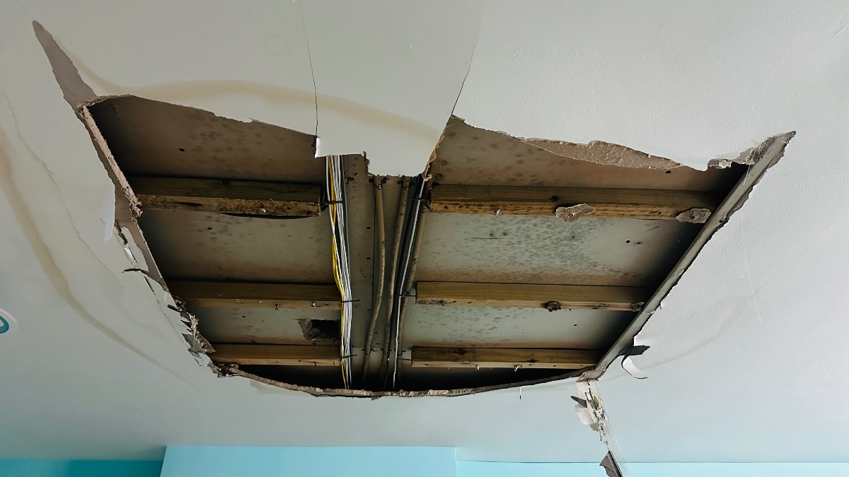 I need a section of my dining room ceiling repaired where plasterboard was removed due to a water leak from the upstairs bathroom. The leak has been identified and is being repaired. I now need someone to install it . The damaged area is small (well under 1 sqm), but the opening may need to be squared for a proper repair.