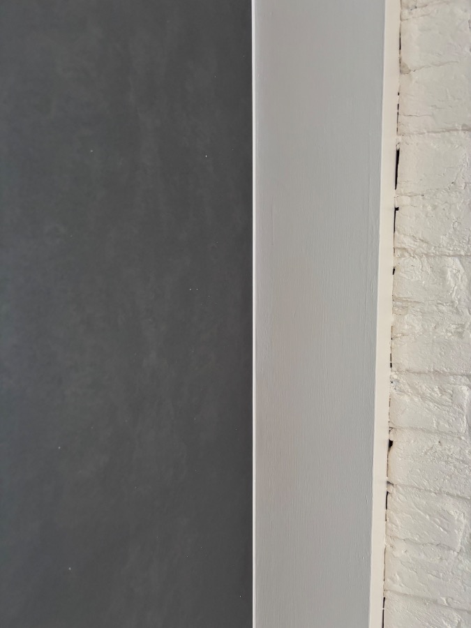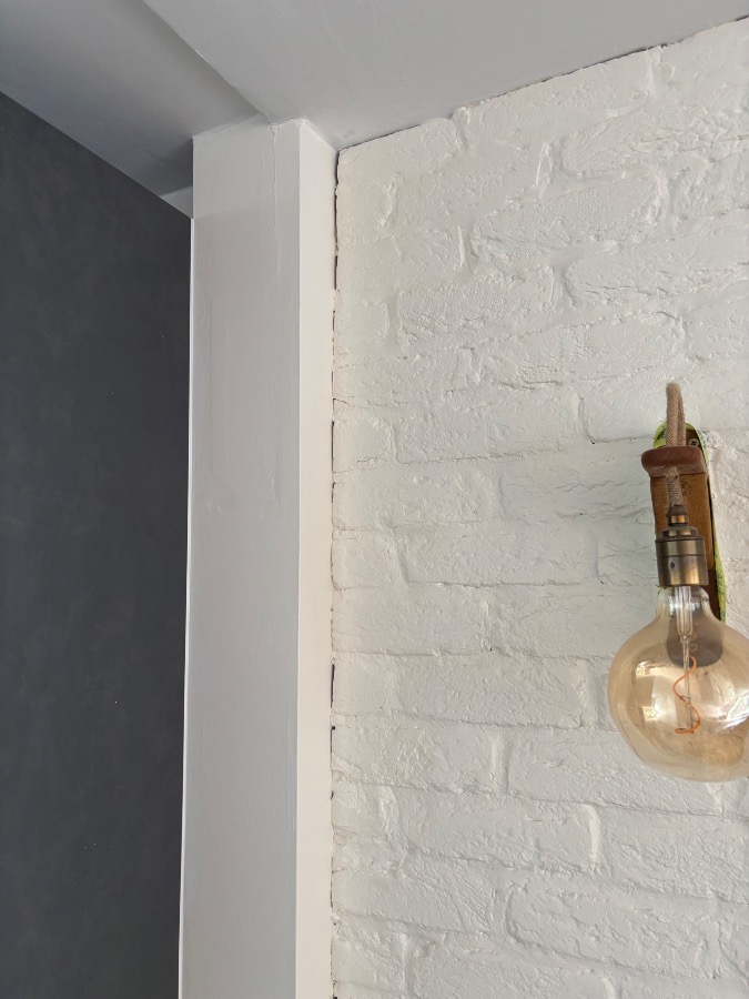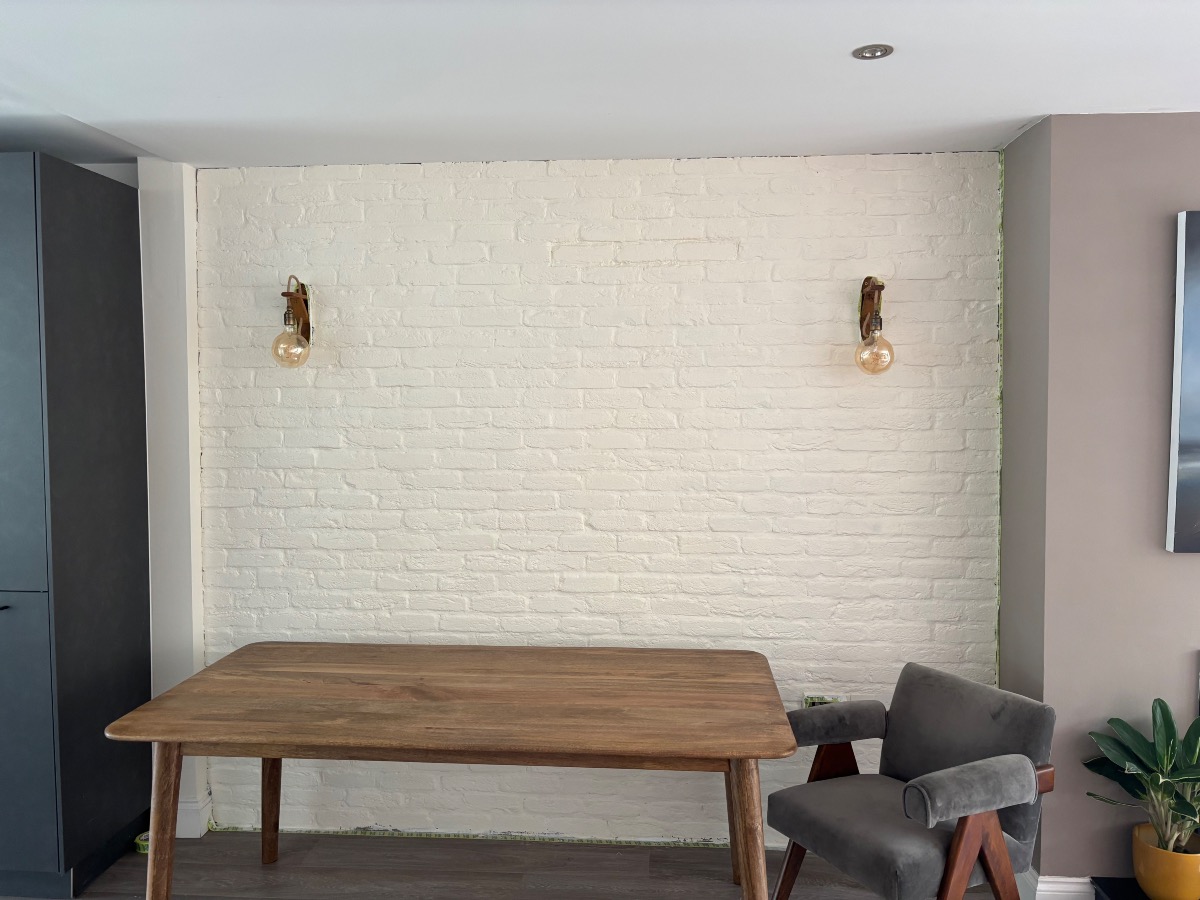 Recently painted internal brick wall. Need all the edges filled/sealed with white filler. Professional/pristine finish required. To match the strip on kitchen in photos below.