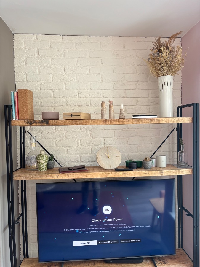 Is it 2 brick walls you want filled? One wall with the table and the other wall with the shelf and TV? Or only one wall?