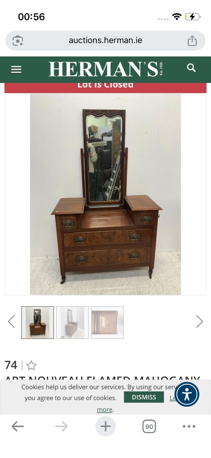 I need a dresser to be picked up on Monday or Tuesday from an auction house in Rathmines and brought to my apartment on St Augustine St. I live on the third floor and there is no lift. This is the description of the dresser: ART NOUVEAU FLAMED MAHOGANY VANITY DRESSER - the carved crest within an arched bevelled mirror panel, over two flanking short drawers and two graduating long drawers, elevated on turned legs, terminating on ceramic castors, 189 x 107 x 52cm. These are the opening hours for the auction house: Monday: 09:30 AM - 1:00 PM & 2:00 PM - 5:30 PM Tuesday: 10:30 AM - 1:00 PM & 2:00 PM - 5:30 PM