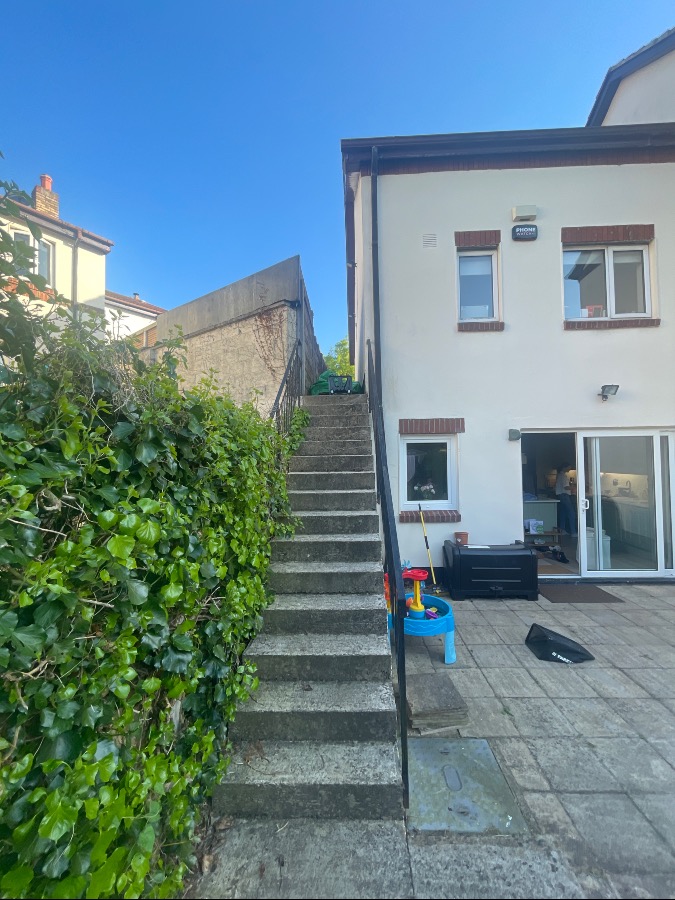 Dig out silty soil area manually and carry up steps then wheelbarrow to Skip - total about 100 m of moving . Elevated Area 3 x 7 M remove about 60 cm height of earth to make 15cm below ground level. Area not suitable for micro digger due to steps.